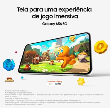 A Samsung também aprimorou a eficiência energética do chip, garantindo um equilíbrio entre potência e autonomia. Na prática, o Galaxy A56 5G dá conta de rodar até mesmo jogos mais pesados, desde que os gráficos sejam ajustados conforme a demanda de cada título.
